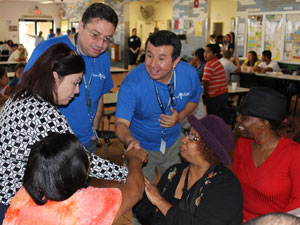 Pictured (standing left to right) are Family Liaison Elva Benitez and community volunteers Fernando Pacheco and Esteban Sanchez who are being thanked by family members of a youth at Evins that they sponsored with an overnight stay at a local hotel. In addition, the Evins Volunteer Council assisted with a gift gas card allowance to make the trip possible. The family attended the Annual Volunteer “Feast of Sharing” Thanksgiving meal and traveled more 1,200 miles round trip from their home town. Thirty-two turkeys were cooked for the event and more than 100 volunteers helped serve over 500 plates for the event.